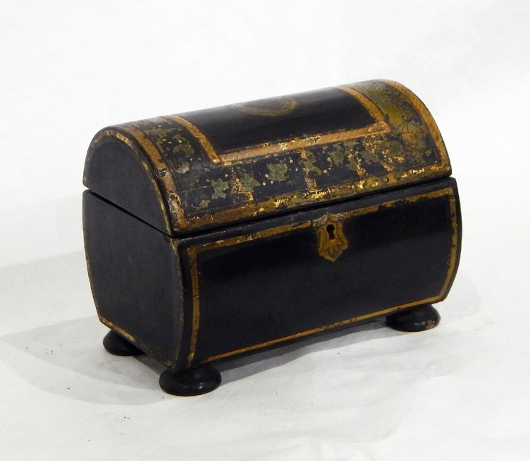A 19th century papier mache tea caddy having domed top, with gilt and green painting, on bun feet