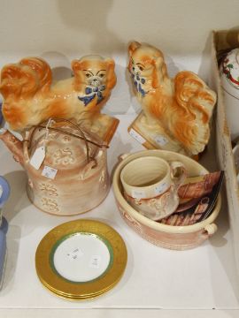 Items of pottery by Philip Wood including a two-handled dish, cup and other items including a pair of dog ornaments and three saucers (8)