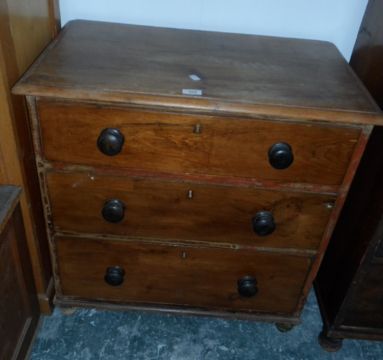 A 19th century pine chest of three graduating drawers with bun handles, on bun feet, 74cm wide