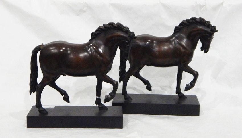 A pair of bronzed-effect resin model prancing horses on plinth bases, 27cm high