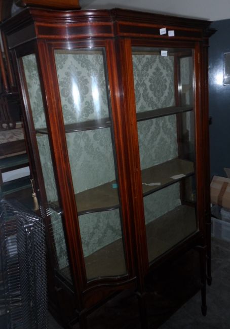 A mahogany display cabinet with stringing borders, two internal shelves, on square tapering legs