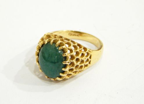 A gold-coloured ring with central green oval cabochon, with pierced mount, marked 14K