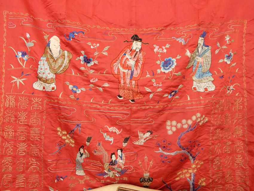 A late 19th century Chinese embroidered silk temple hanging, red ground with figures, birds and flowering prunus in lakeside landscape to centre, Chinese characters to border, approx. 300cm x 200cm