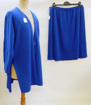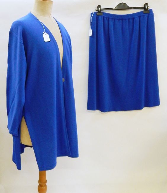 A black pintucked and lace evening dress, a silk drop waist evening dress labelled "Kitty Copeland, London, W1", a Skiff & Hawkins of Cheltenham peasant style blouse with embroidery, a wool twin set by Jean Muir, marked "Jean Muir Telegraph Magazine" in blue wool, a grey woollen skirt and a Sylvia Mills matching dress and coat in green