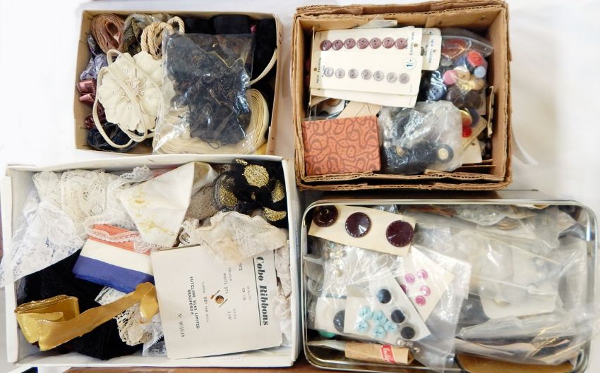 A large quantity of buttons, trimmings, beads, sewing items, etc. (5 boxes)