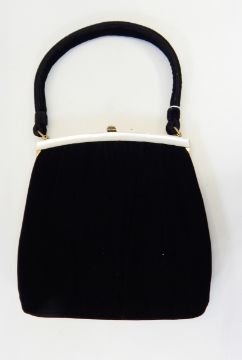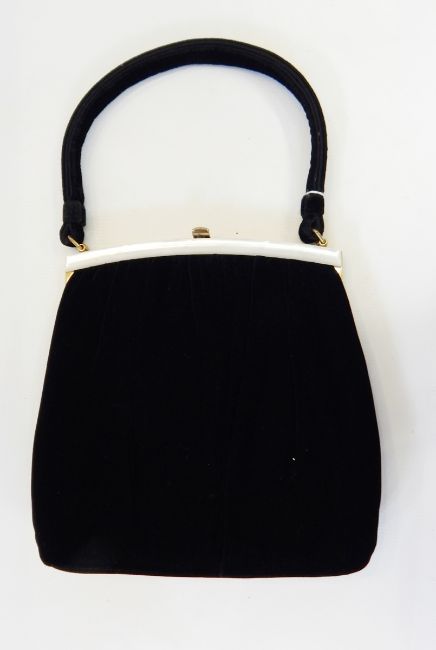 A 1950's Ingber velvet evening bag with brass-coloured fixed frame, one side trimmed with bakelite, black velvet carry handle