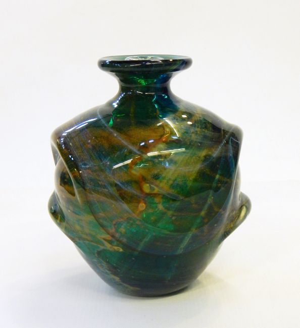 A Mdina glass vase and stopper of swirling designs in brown and yellow, on green ground, 15cm high