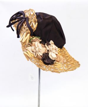 A black and white spotted 1950's hat from Harrods labelled "Otto Lucas Jnr", some feather trimmings, a wooden milliners hat and a vintage straw and satin net trimmed hat, etc. (1 box)