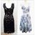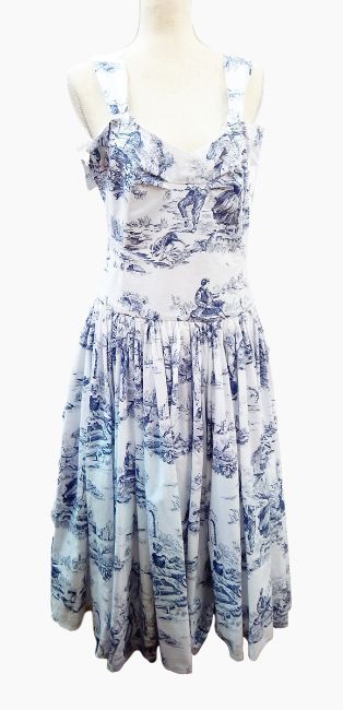 A black laser cut cocktail dress with a 1950's style toile de jouy sundress in blue printed on white (2)