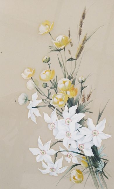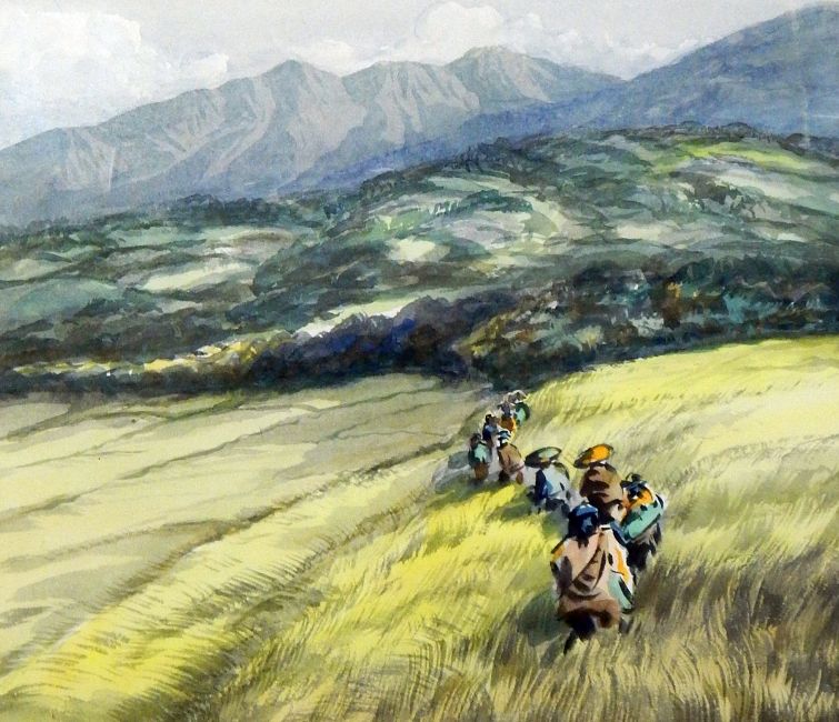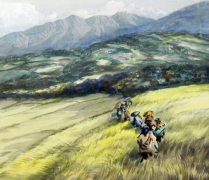 Unattributed Watercolour "Jack Goes to Bed at Noon", flowers and butterflies, 49cm x 37cm and another Oriental school Watercolours Farm workers walking through field with hills in background, signed indistinctly, 23cm x 26cm Farm workers walking through the rice paddies with mountains in background, signed indistinctly, 24cm x 27cm Boats moored up on river bank, signed indistinctly, 23cm x 26cm Stirling (20th century) Watercolour Street scene with terraces on either side, signed in pencil lower right, 38cm x 36cm (6)