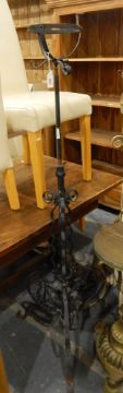 A wrought iron lamp stand on openwork tripod scroll base