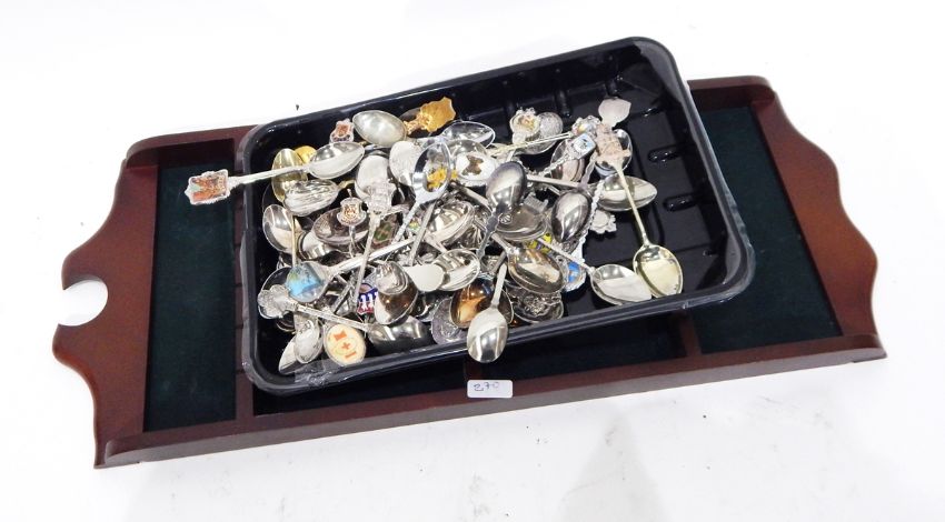A silver plated tray of circular design with pierced borders, a silver plated butter dish and cover, other items of silver plate and a collection of souvenir teaspoons