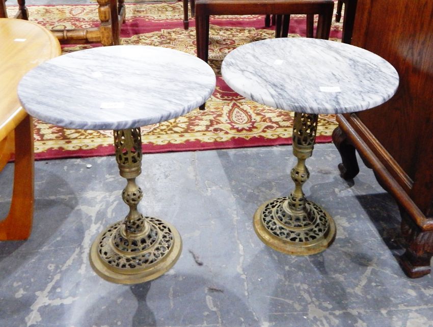 A pair of circular marble top wine tables on pierced brass pedestals (2)