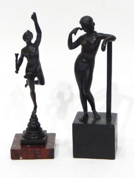 A bronze model of a standing female figure on integral square base, 23cm high and another bronze model of a woman on square veined red marble base, 24cm high (af) (2)