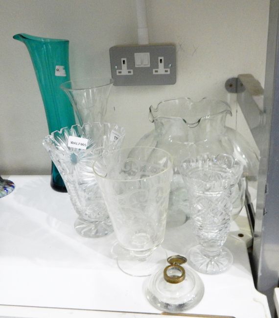 A large glass bowl of lobed design, 22cm, a large ale glass the trumpet bowl engraved with hops and barley, on a folded foot, 26cm and five other items (7)