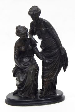 A spelter figure group of two maidens raised on plinth base, height 35cm