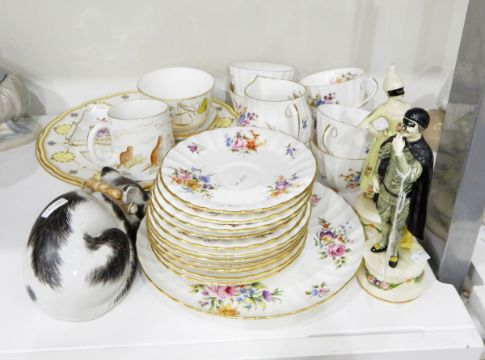 A porcelain model of a sleeping cat, a Royal Worcester 'Roanoke' pattern tea set comprising six cups and saucers, side plates, cake plate, sugar bowl and milk jug and various other items