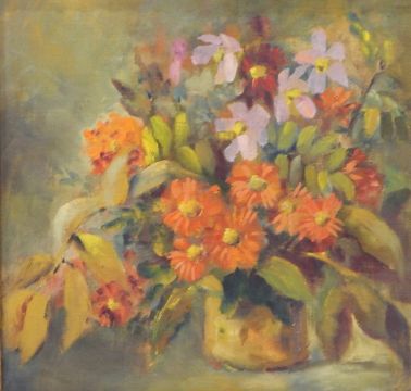 S E Keene Oil on canvas River scene with mountains beyond, signed and dated 82 lower left, 29cm x 50cm Unattributed Oil on canvas boardStill life of autumnal flowers, 37cm x 39cm G Molinaz Watercolour Mediterranean coastal town, signed lower left (3)