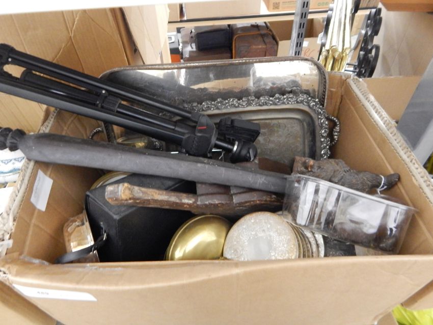 A quantity of assorted items including a 1970's bakelite telephone, a camera tripod, a tin bear money box, silver plated trays, Wedgwood style teapot, etc. (2 boxes)
