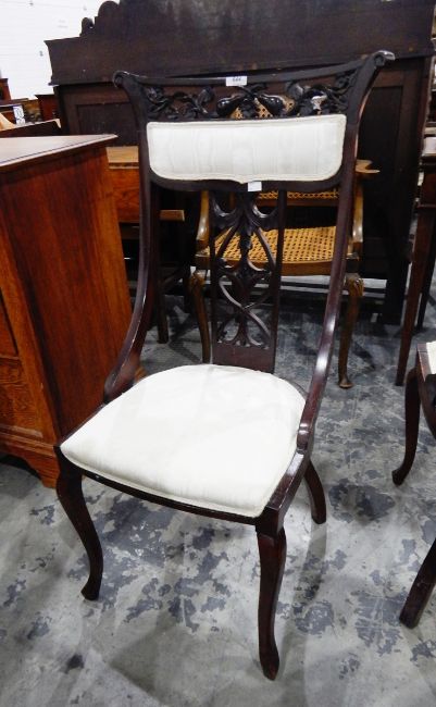 A pair of Edwardian stained as mahogany chairs with fruit and foliate carved crest padded crest rails and carved and pierced splats, on cabriole shaped supports (2)