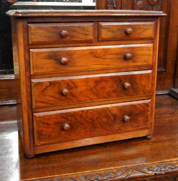 A late Victorian walnut miniature chest with moulded edge top, two short and three long drawers, on bun feet, width 37cm