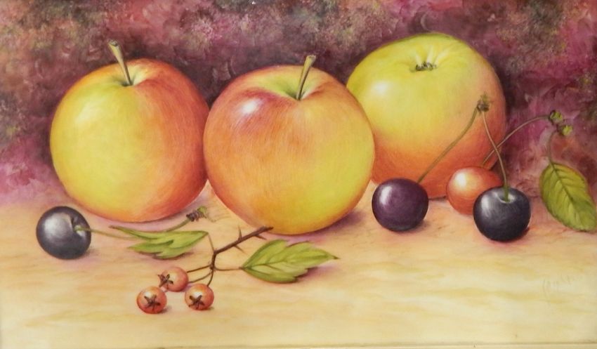 A pair of porcelain panels decorated with still lifes, depicting apples and cherries on one and apples and brambles on the other, indistinctly signed lower right, 17.5cm x 30cm (framed)