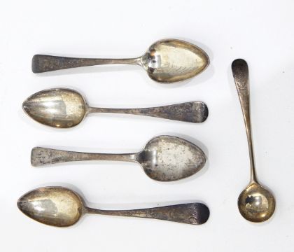 A George III silver mustard spoon, London 1803 by Peter, Ann & William Bateman and four other Georgian silver teaspoons