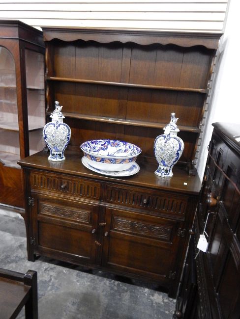 A reproduction oak dresser with plate rack, two short drawers and cupboard underneath, 122cm wide