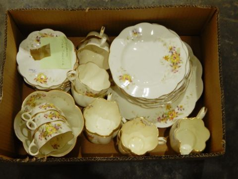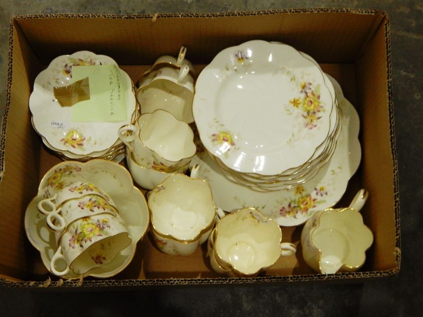 A part tea service by Chapman, white ground with orchid decorations and wavy and gilt edges to plates and mugs, with KPM Kirster part dinner service, white ground with stylised rosebuds (2 boxes)