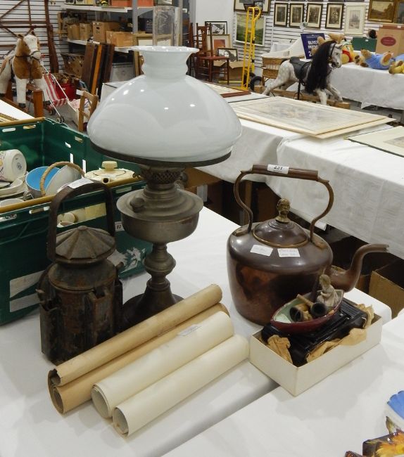 A metal oil lamp with glass shade, a railway lamp, a Pears print, two cameras and other items
