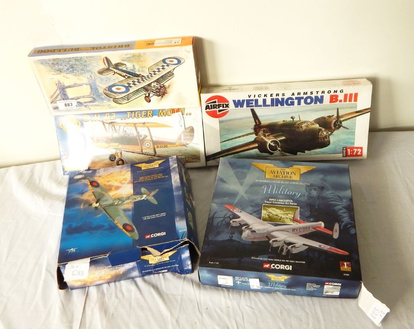 Two Corgi Aviation Archive diecast models, the Avro-Lancaster Royal Canadian Air Force and the Submarine Spitfire MKVEN95-1/RF-D Donald Duck, an Airfix Vickers Armstrong Wellington B.3 model and two other model kits (5)