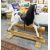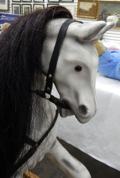 A modern wooden rocking horse, the dappled grey horse with saddle and stirrups, on wooden base
