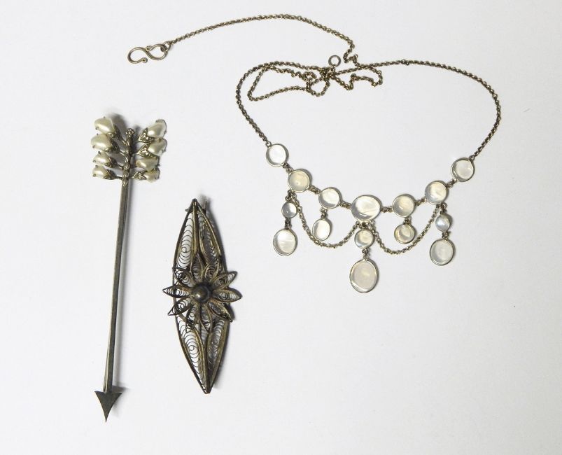 Silver fringe necklace set with moonstone cabochons, arrow brooch and filigree brooch with central flowerhead (3)