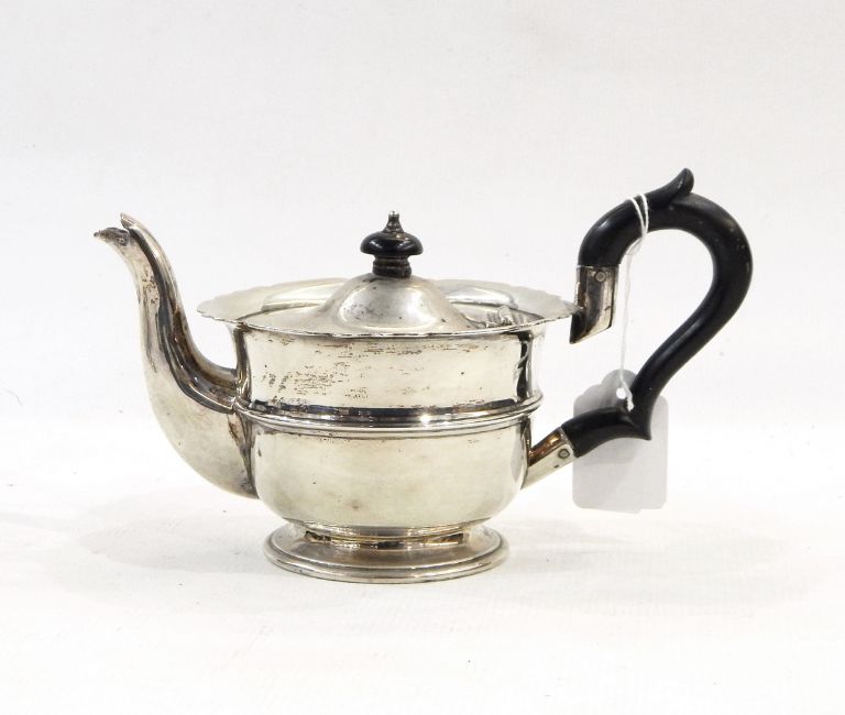 Edwardian silver teapot, Birmingham 1904 of circular form with shaped rim, moulded girdle, on collet foot