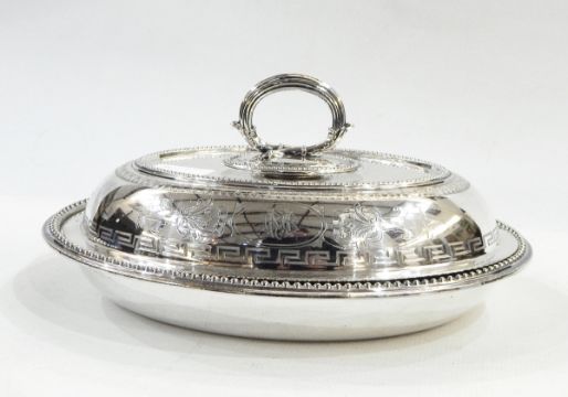 Victorian silver plated entree dish and cover of oval form with engraved decoration including a crest and motto, with bead borders, 31cm long
