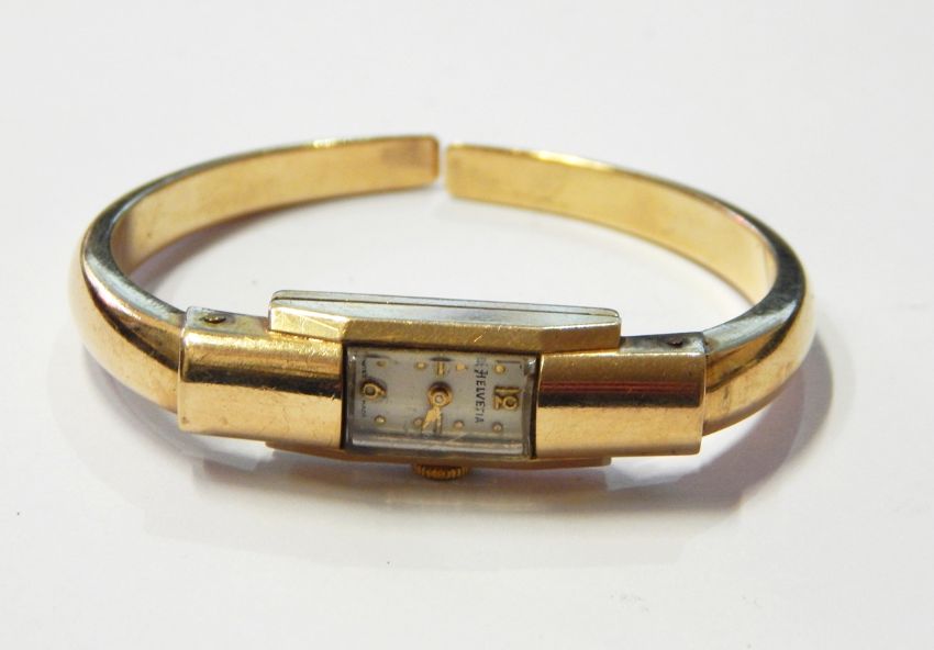 Lady's 9ct gold Helvetia bangle watch with rectangular dial and plain hinged bangle and lady's 9ct gold Avia bracelet watch (the expanding bracelet broken) (2)