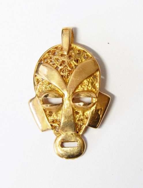 Gold pendant modelled as a mask with filigree decoration, marked 18ct
