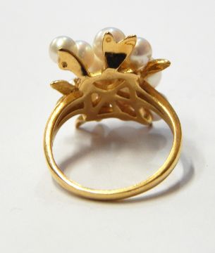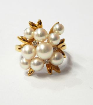 18K gold, pearl and diamond dress ring, modern branch design set with numerous graduated pearls and three diamonds together with cultured pearl bracelet