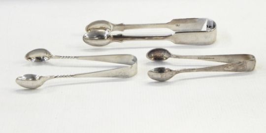 Silver vesta case of square form with engraved foliate scroll decoration, pair of Victorian fiddle pattern silver sugar tongs, another pair of silver sugar tongs and three other items of silver plate