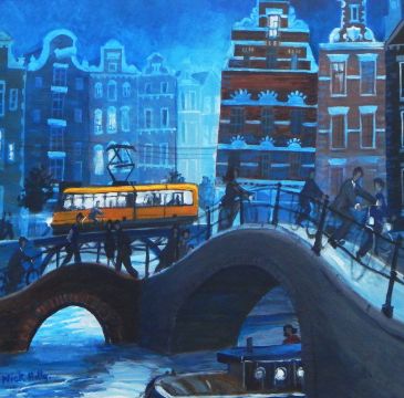 Nick Holly (b.1958) Acrylic on canvas "Bridges, Amsterdam" figures on bicycles over bridge with barge beneath and tram and Dutch gabled houses in background, 60cm x 60cm