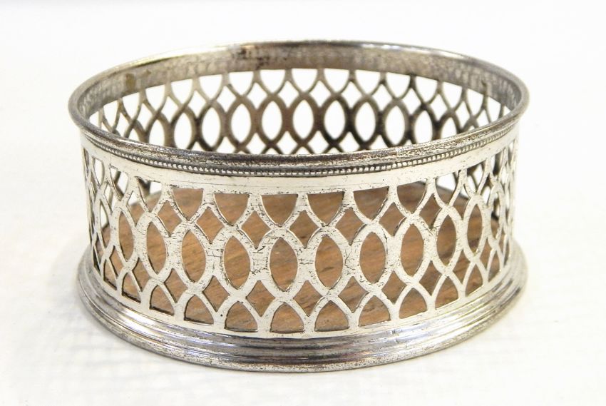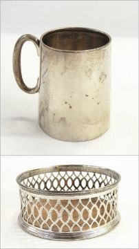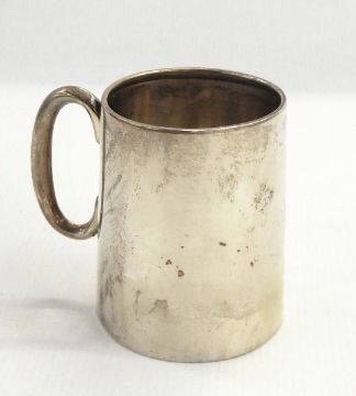 Silver mug, Birmingham 1928, of plain tapering circular form, 7.5cm high and small silver coaster, Chester 1902 of circular form with pierced rim, 8.5cm diameter (2)