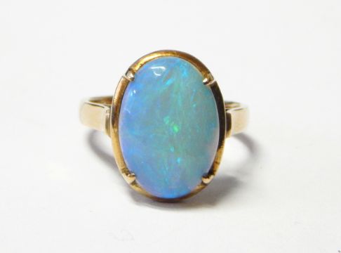 Gold and opal ring, the oval opal cabochon in four-claw setting, marked 14K