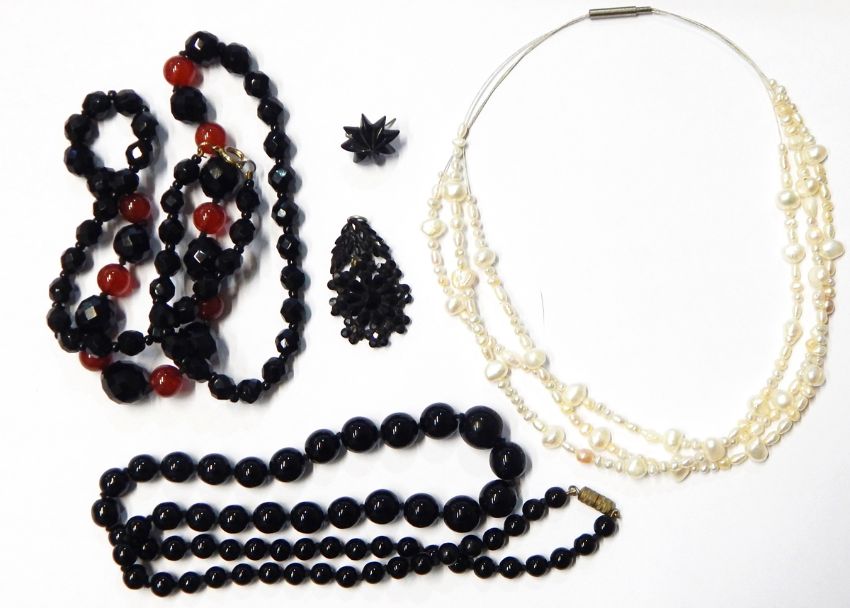 String of faceted French jet and cornelian graduated beads, another string French jet beads, triple-string freshwater pearls and jet pendant with single earring