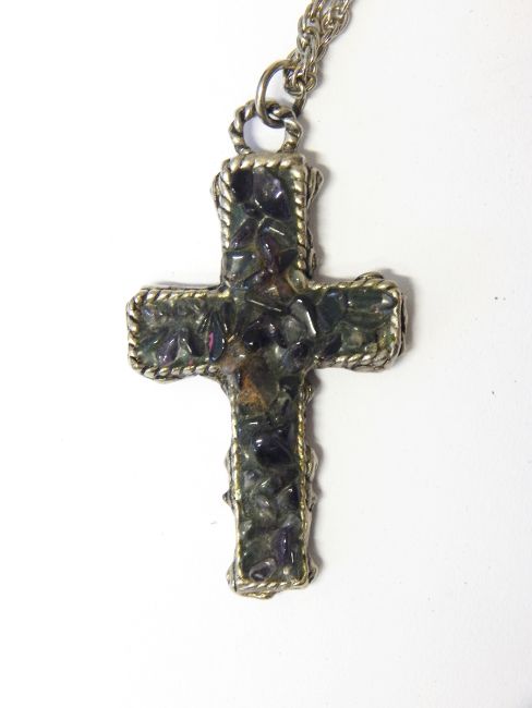 Silver-coloured cross pendant set with amethyst and other quartz, on Prince of Wales link chain