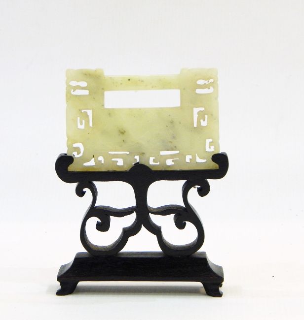 Jade ornament in the form of a lock, carved a landscape to one side and Chinese characters to the other symbolising longevity and prosperity, on wooden stand and with original fitted box
