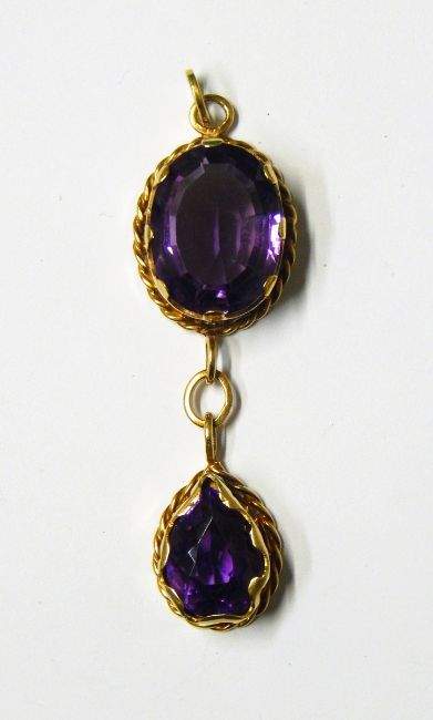 18ct gold and amethyst pendant the oval mixed cut amethyst with pear-shaped amethyst drop beneath, with rope-twist borders
