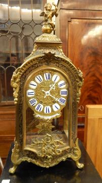 French brass inlaid and ebonised mantel clock having winged cherub finial, glass door and side panels, the eight-day movement having Roman numerals, on porcelain plaques and bearing the name "Balthazar, Paris", the pendulum having sunburst, 50cm high