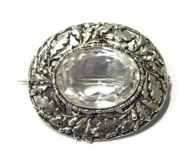 Arts & Crafts silver brooch of oval form, the central colourless paste within a border of oak leaves and acorns