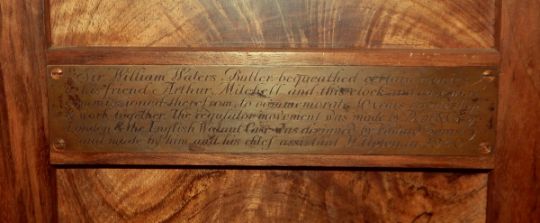 Edward Barnsley walnut regulator longcase clock, the hood with angular arched pediment, the circular steel dial with subsidiary seconds and hours dials and inscribed "Dent, 41 Pall Mall and 4 Royal Exchange, London", no.62959 behind octagonal glazed door, the trunk having door with two fielded panels, brass label to interior engraved "Sir William Waters Butler bequeathed certain monies to his friend Arthur Mitchell and this clock and case were commissioned therefrom, to commemorate 40 years friendship and work together. The regulator movement was made by Dent & Co of London and the English Walnut Case was designed by Edward Barnsley and made by him and his chief assistant H Upton in 1940", similar panels to the base, all with holly and ebony chequered stringing and wavy line ebony beading, on plinth base, 207cm high This collection comes from the late Arthur Mitchell from the brewers, Mitchell & Butler, who commissioned many of the pieces directly from Gimson, Barnsley and Peter Waals. He was a strong supporter of the Cotswold School and a good friend of Edward Barnsley, son of Sidney Barnsley. Arthur Mitchell lived in Cheltenham at Glenfall House and pieces from his collection are also to be found at the Cheltenham Wilson Art Gallery Museum in the Arts and Crafts Department