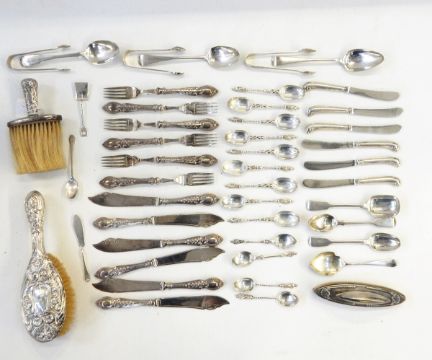 Two silver-backed brushes with embossed decoration, nine silver apostle teaspoons by Charles Edwards, London 1880, set of six silver-handled pistol grip cake knives and other items of Georgian and later flatware